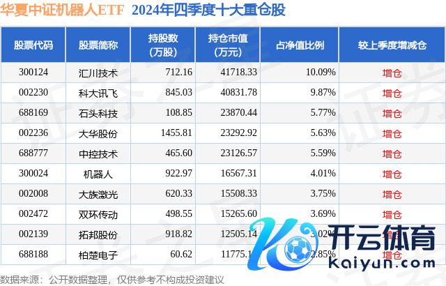 中原中证机器东谈主ETF为指数型-股票基金,凭据最新一期基金季报线路,该基金金钱建立:股票占净值比99.58%,无债券类金钱,现款占净值比1.78%。基金十大重仓股如下: